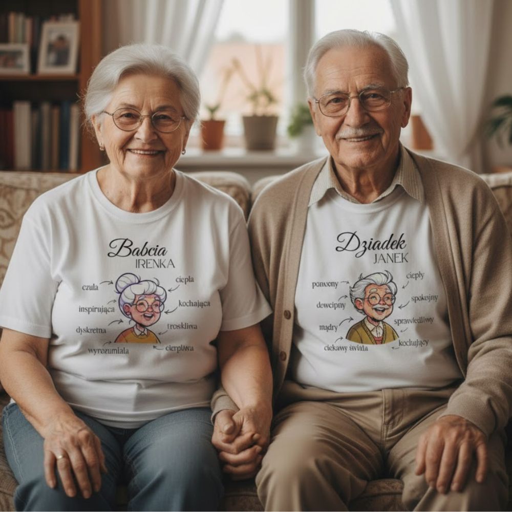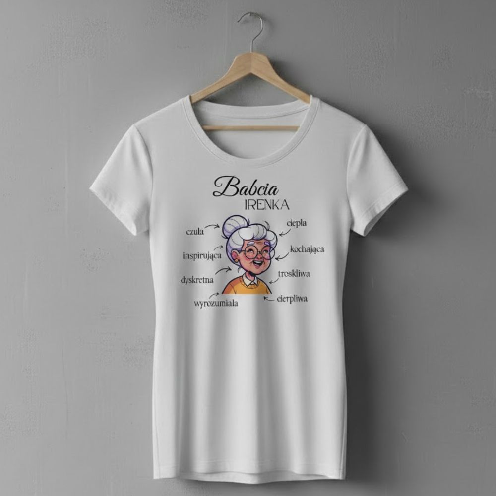 Personalizowana koszulka dla babci, która łączy ciepłą ilustrację z wyjątkowym przesłaniem. Imię oraz opisujące ją cechy nadają całości osobisty charakter i podkreślają, jak niezwykłą osobą jest babcia. Idealny prezent na Dzień Babci, urodziny lub bez okazji — pełen ciepła i emocji.