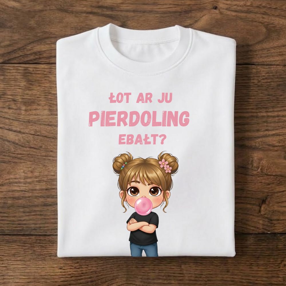 Fonetyczne zderzenie angielskiego zwrotu z polską dosadnością, rozbrojone grafiką uroczej dziewczynki. Idealna dla osób z dużym dystansem do siebie i świata, które jednym spojrzeniem potrafią uciąć każdą zbędną dyskusję.
