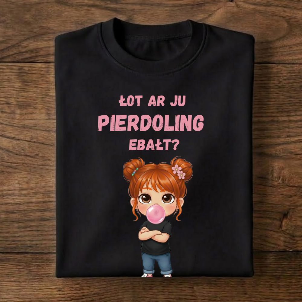 Fonetyczne zderzenie angielskiego zwrotu z polską dosadnością, rozbrojone grafiką uroczej dziewczynki. Idealna dla osób z dużym dystansem do siebie i świata, które jednym spojrzeniem potrafią uciąć każdą zbędną dyskusję.