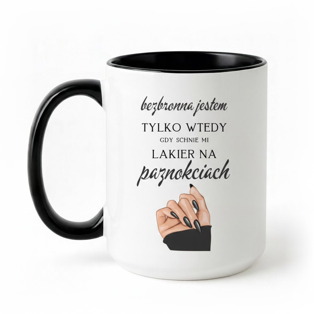Ten kubek to zabawne przypomnienie, że Twoja siła nie zna granic – z jednym, bardzo krótkim wyjątkiem. Idealny dla kobiet, które na co dzień „przenoszą góry”, a jedyną chwilą wytchnienia (i wymuszonej bezbronności) jest czas schnięcia lakieru. Genialny prezent dla szefowej, bizneswoman lub każdej przyjaciółki, która twardo stąpa po ziemi, ale zawsze dba o detale.