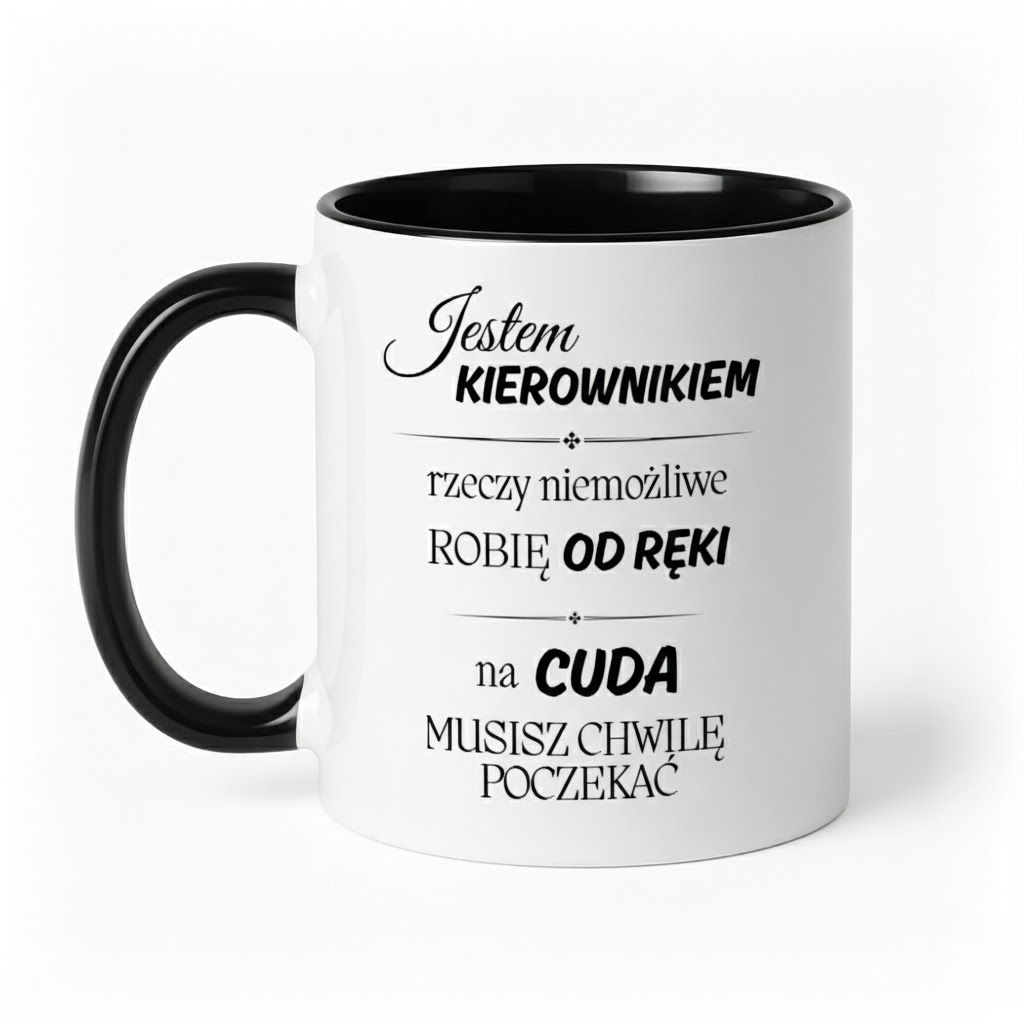 Dynamiczny i humorystyczny kubek „Cuda kierownika” to świetny pomysł na prezent dla osób zarządzających zespołem lub firmą. Stanowisko można dowolnie zmieniać (np. dyrektor, manager, brygadzista), dzięki czemu projekt łatwo dopasować do konkretnej osoby. Idealny jako żartobliwy upominek do biura, na awans czy urodziny.