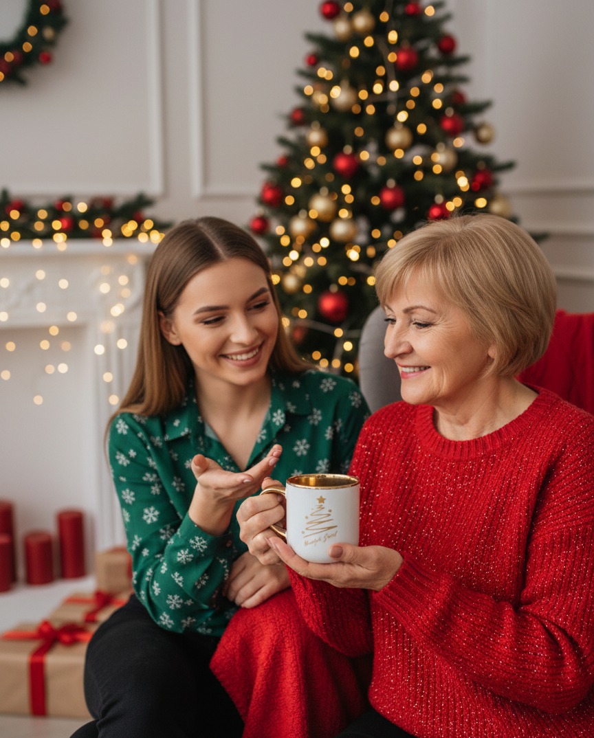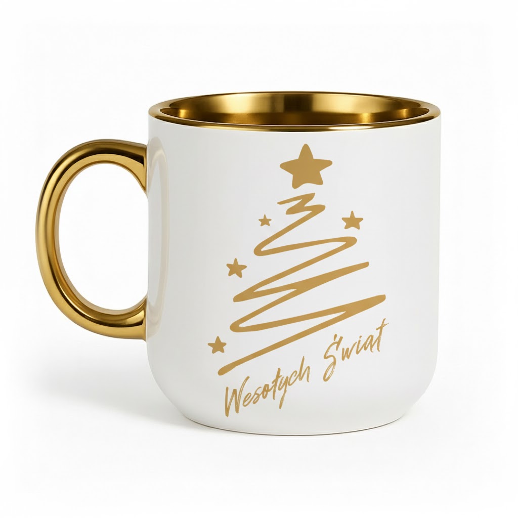 Ten wyjątkowy nadruk na kubku to kwintesencja świątecznej elegancji i ciepła. Centralnym elementem jest minimalistyczna, abstrakcyjna choinka w kolorze beżowo-złotym, której kształt tworzy dynamiczna, pociągnięta linia, symbolizująca radosny wir świątecznych przygotowań. Wzór ten jest dodatkowo ozdobiony małymi gwiazdkami, a całość wieńczy pięknie kaligrafowany napis „Wesołych Świąt”, idealnie oddający atmosferę magii i blasku Bożego Narodzenia.